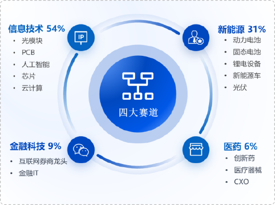 行情总结及主要不雅点: 上周A股阛阓合座呈现下落趋势:沪深300跌2.19%,中证500跌5.82%,中证1000跌5.25%,创业板50涨2.24%,科创50跌4.03%。来往面,A股阛阓日均成交额在2.2万亿支配。近期阛阓热门轮动较快,未酿成明确来往干线,冷落关切战略启动的绿电和景气度高的算力产业链,以及基本面事迹优异的板块,如中期产业趋势细则性较高、要素股占据龙头上风且基本面事迹较优的创业板50指数(涵盖高权重的光模块、新动力等领域龙头)。 创业板为主要“三创(立异、创造、创意)四新(新时期、新产业、新业态、新状貌)”的成长型立异创业企业提供径直融资平台。权重行业方面,创业板50指数聚焦信息时期+新动力+金融科技+医药四大新质分娩力赛说念,科技成长属性纯正。 图:创业板50指数四大赛说念