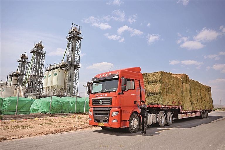在内蒙古赤峰市阿鲁科尔沁旗,满载牧草的货车准备出发。新华社发