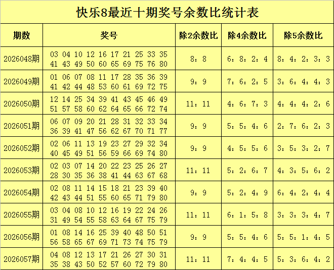 福彩自得8第2026057期开奖追忆:04 08 12 13 17 21 26 27 30 31 35 38 43 50 52 57 60 72 79 80,其中奖号二区比为8:12,四区比为5:7:5:3,五区比为4:6:3:4:3,除2尾数比为9:11,除4尾数比为7:4:4:5,除5尾数比为5:3:6:4:2。