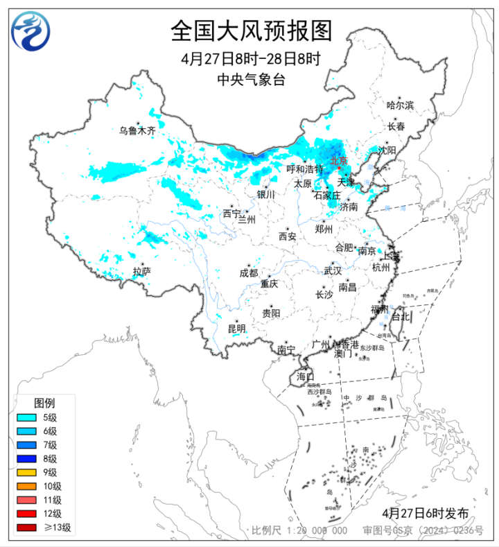 图2天下雷暴大风或冰雹预警(4月27日08时-28日08时) (2)朔方地区多大风天气 预测,4月27日08时至28日08时,内蒙古中西部、山西东北部、河北北部和西部、北京、天津、辽宁中西部、山东东部等地部分地区有6~8级风,阵风8~10级,局地阵风可达11级以上(见图3)。中央处所台4月27日06时连续发布大风黄色预警。 此外,27日,内蒙古东南部、华北北部、东北地区东部、黄淮西部、江淮等地部分地区有散播性阵雨或雷阵雨,斗鱼体育app官网局地伴有短时大风。