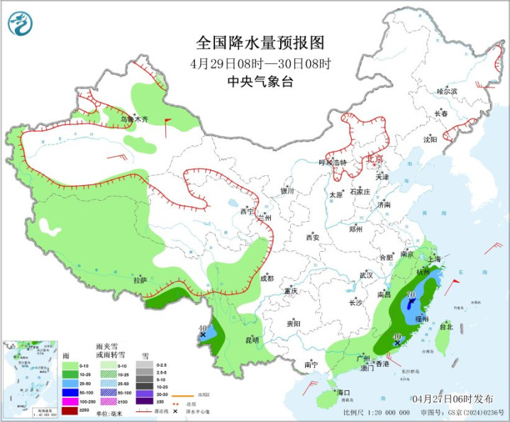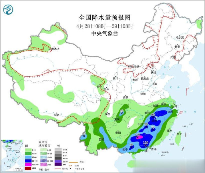 图4天下降水量预告图(4月27日08时-28日08时) 4月28日08时至29日08时,新疆北疆北部阿勒泰山区局地有小雪或雨夹雪。江淮西部、江南大部、重庆中西部、云南西北部和中东部、华南大部等地部分地区有中到大雨,其中,安徽南部、江西中北部和西南部、湖南南部、广西东部、广东中北部等地部分地区有暴雨,局地大暴雨(100~120毫米)。新疆南疆盆地部分地区有5~6级风,东海北部、北部湾将有5~7级风、阵风7~8级(见图5)。