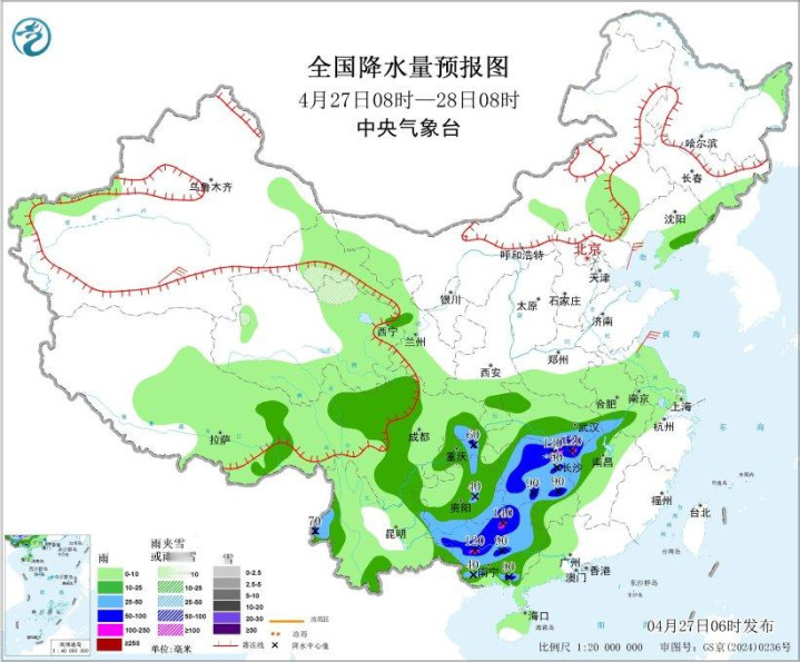 图1天下强降雨落区预告图(4月27日08时-28日08时)