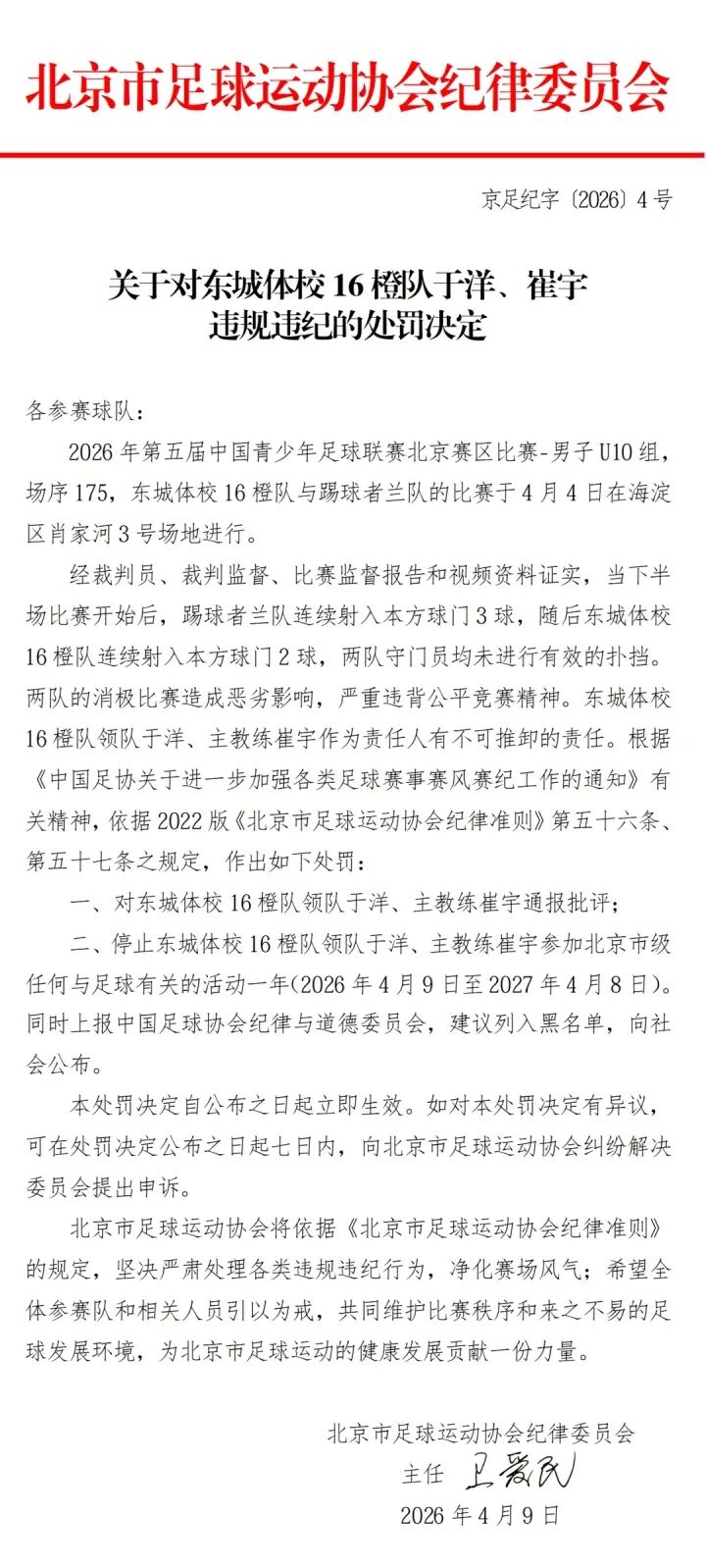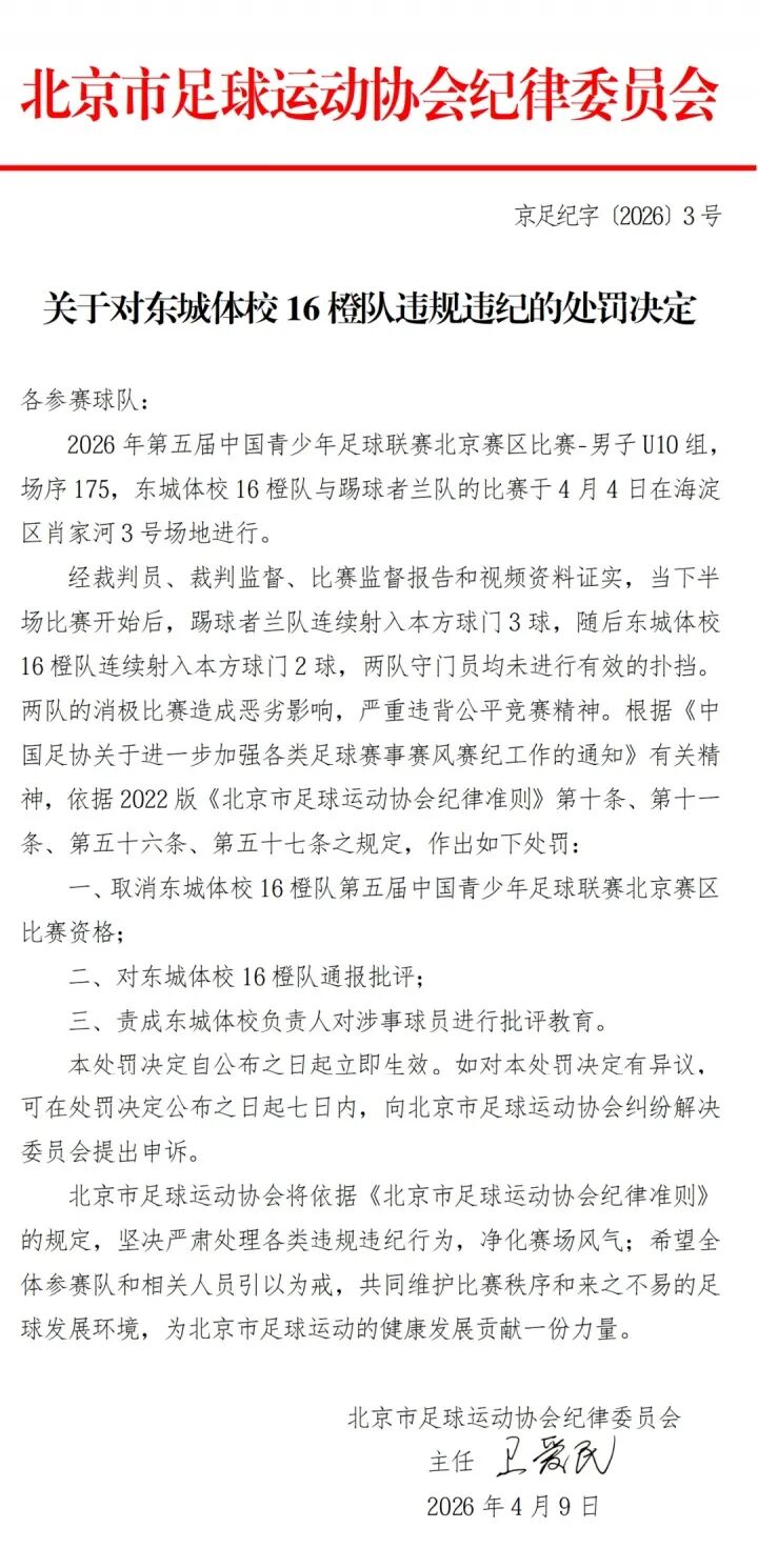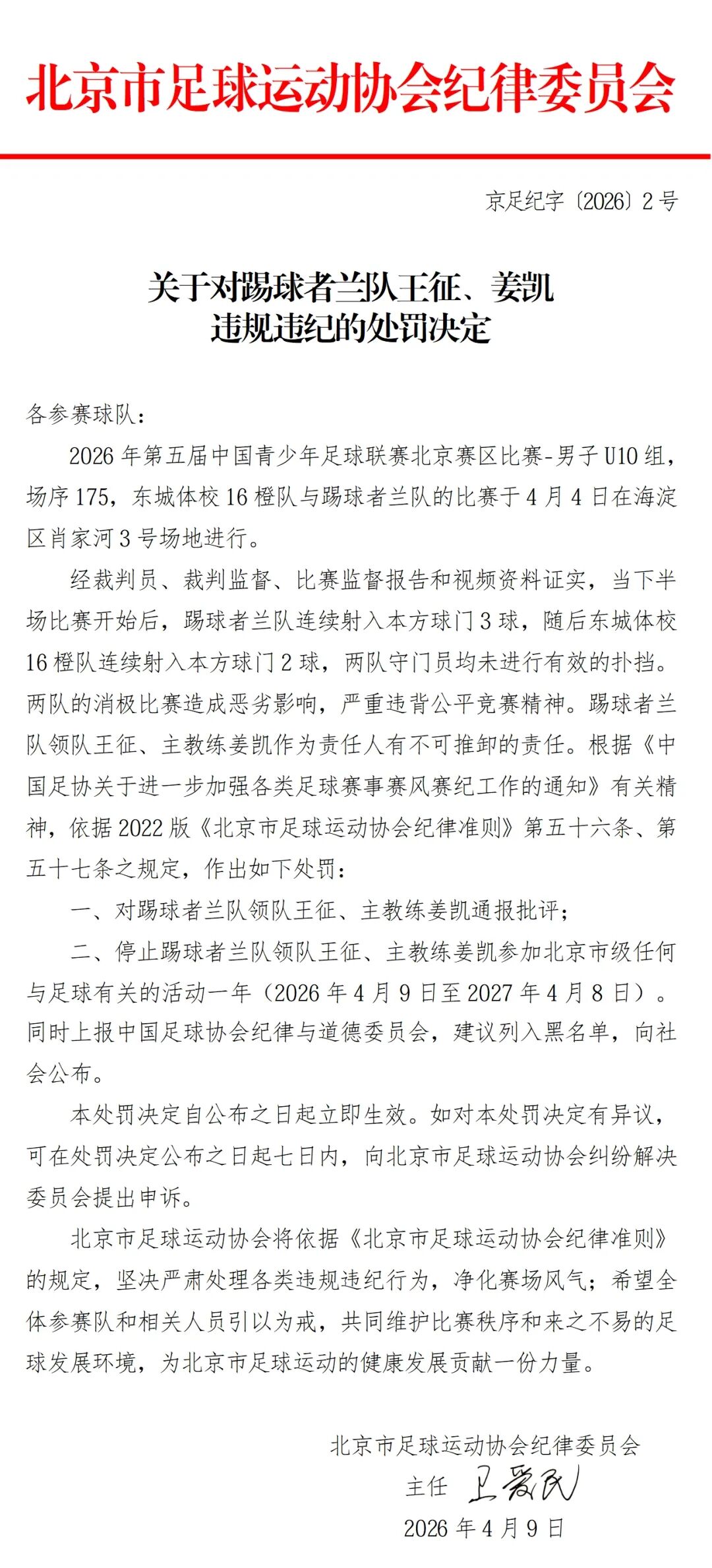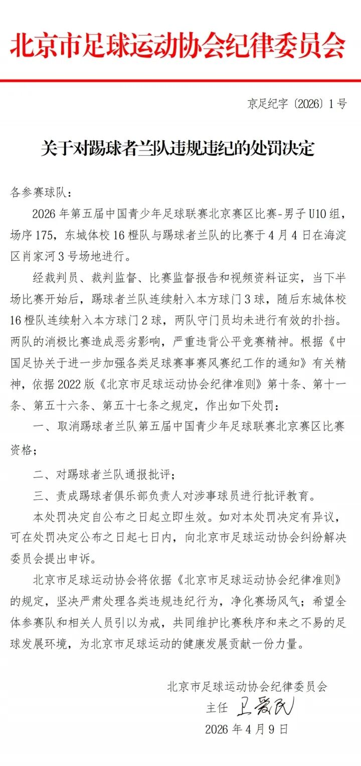 4月9日,北京足协发布四条管制决定,对中青赛北京赛区U10组东城体校16橙队和踢球者兰队在比赛中互射本方球门的算作处以取消赛事阅历,两队领队及主提醒均被禁赛一年。 北京足协公告中暗示,2026年第五届中国青少年足球联赛北京赛区比赛男人U10组东城体校16橙队vs踢球者兰队的比赛下半场,踢球者兰队说合射入本方球门3球,斗鱼体育app官网东城体校16橙队说合射入本方球门2球。 鉴于两队无望比赛变成的恶劣影响,两支球队均被取消比赛阅历,并被通报月旦。此外东城体校16橙队主提醒崔宇、领队于洋,踢球者兰队主提醒姜凯、领队王征,也均被通报月旦,并辞谢投入北京市足球行径一年。