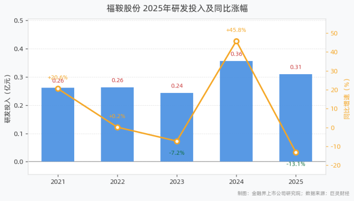 4月27日,福鞍股份(603315)袒露2025年年度申诉。申诉期内,公司全年研发参加达0.31亿元,同比下滑13.05%,占交易收入比例2.42%。昔日五年,公司研发参加复合增长率为3.35%。